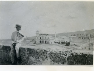 Este muchacho, de dril blanco y sombrero canotier, contempla el paisaje sentado sobre la muralla de la Torre del Reloj. La Estación del ferrocarril al fondo.