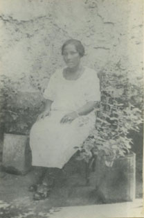 Una señora sentada contra un muro con matas en latas a cada lado.