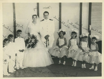 Se observa a Máximo Caldas y Ana María Lemaitre Donner acompañados de los niños Clara Elena Lemaitre, Matilde Tono, Julia S. Lemaitre, José Lemaitre Tono, Ernesto Lemaitre, Fernando Mogollón, Jaime Tono.