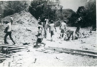 Excavaciones previas a la construcción del Puente de Arroyo de Piedra, obreros en plena obra.