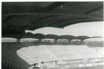 Estadio de Béisbol “Once de Noviembre” aspectos de las gradas y cubiertas, el arquitecto Carlos Santacruz Burbano.