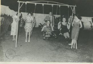 Marina López de Ramírez, Dorothy Jhonson de Espinosa, Dolores A. de Bozzi y Carlos Garzón F. en un parque de diversión.