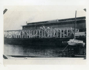 Construcción en planchón, grupo de obreros colocando estructuras metálicas encima de la embarcación.