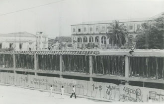 Aparece la construcción del Conjunto Residencial “Santo Domingo”, se aprecian las vigas en plena construcción y consignas de protesta en las láminas de zinc que resguardan la construcción, Playa de la Artillería, barrio Santa Catalina, Centro.