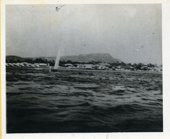 Un velero en la bahía, se aprecia las casas del barrio Manga y al fondo el Cerro de la Popa.