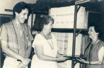 Entrega de 2 álbumes de fotos pertenecientes al desaparecido doctor Napoleón Franco Pareja, por parte de doña Beatriz de la Espriella de Gómez. recibe la señora Dorothy Johnson de Espinosa y Francisco Pinaud, miembros del Centro de Historia Cartagena de Indias en la sede del Archivo Histórico en el Palacio de la Inquisición.