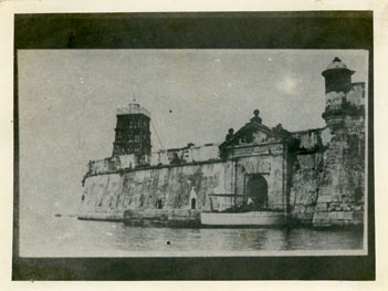 Entrada principal al fuerte de San Fernando, en Bocachica, (Tierrabomba). Se observa el faro, hoy desaparecido.