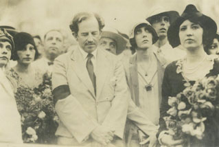 El poeta Guillermo Valencia acompañado de Adela Pombo Grau, María Mathieu de la Vega y Matilde Pombo de Vélez.