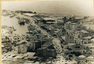 Panorámica del centro de la ciudad hacia Bocagrande, se aprecia en primer plano el edificio Nacional, la bahía de las Ánimas, muelle de los Pegasos y los grandes edificios que lo cercan.