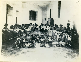 Grupo de niños en el Orfelinato de Santa Clara, que funcionó en el antiguo convento de las Clarisas, ubicado en la plaza de San Diego, barrio Santo Toribio o San Diego, Centro histórico.