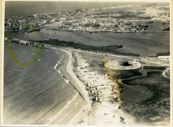 Vista aérea desde el sur hacia el norte, se puede detallar el tanque para crudo, las casas de los empleados de la Andian y el muelle de la Machina.