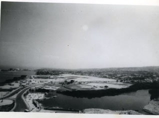 Vista aérea sobre el barrio Chambacú hacia el año 1989. Se aprecia la India Catalina en primer plano, hacia la izquierda el remanente del baluarte de San Miguel.