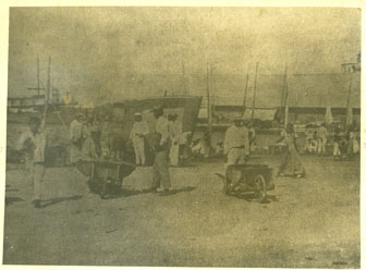 Escena cotidiana en el mercado público de Getsemaní, a orillas de la bahía de las Ánimas. Se observan vendedores con carretillas y los mástiles de los veleros al fondo.