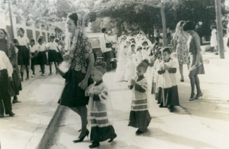 Ana Elvira Román de García directora del Colegio Montessori y los niños; en la ceremonia de las primeras comuniones.
