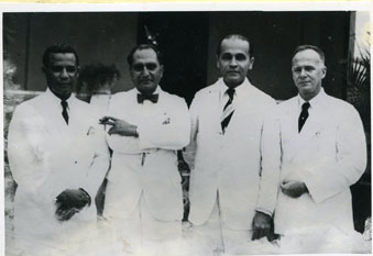 De izquierda a derecha: Eusebio Vargas Vélez, Miguel A. Lengua, Francisco Obregón Jaraba, Ismael Porto Moreno decano facultad de medicina Universidad de Cartagena, durante la inauguración de la Clínica de Maternidad Rafael Calvo. Dic. de 1955.