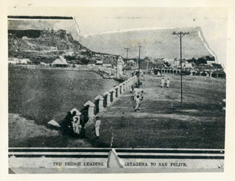 Puente de Heredia que comunica al barrio Getsemaní con el centro histórico, al fondo a la izquierda el Castillo San Felipe de Barajas.