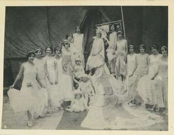 Reina coronada, posa con su corte y pajes.