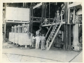Trabajadores al interior de la fábrica del ingenio Central Colombia. Para 1938 casi el total de la población de los corregimientos vecinos de Sincerín, Malagana, San Basilio, San Pablo, María La Baja, Caño Salado, San Jacinto, vivían directa o indirectamente del ingenio, especialmente en tiempos de zafra.