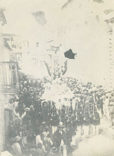 Se observa gran número de personas y el carro alegórico a la conmemoración del centenario de José Fernández de Madrid e inauguración del Parque.