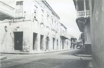 Foto tomada desde la acera del torno de Santa Teresa, barrio Santa Catalina, Centro. Se observan casas en ruinas.