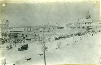 Estación de taxis en el muelle de los Pegasos. Se observa la cúpula de la Catedral en construcción.