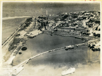 Vista aérea de la entrada a Bocagrande. El hoy parque de la Marina era entonces parte de la bahía de las Ánimas. En primer plano la carrilera del tren que conduce al muelle de carga de La Machina, hoy desaparecido.