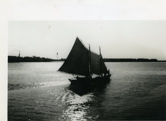 Aparece una embarcación de vela, aproximándose a la orilla, y a lo lejos se aprecia un faro.