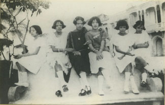 Grupo de niñas en una banca en el parque Centenario.