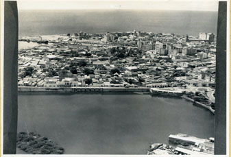 Panorámica aérea hacia el barrio Getsemaní, apreciándose el Puente Heredia a la derecha, al fondo el centro histórico y todos sus edificaciones.