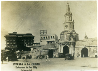 Entrada principal al Centro Histórico, cuando todavía era permitido el tráfico vehicular. Sobresaliendo a la muralla vemos el moderno edificio de oficinas construido por la Andian National Corporation, la compañía que construyó el oleoducto Barrancabermeja - Cartagena. También el paso del ferrocarril.