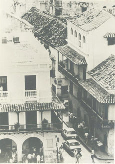 Calle del Cañón Verde conocida hoy como Calle de Portocarrero, se observa el Portal de los Dulces a la izquierda, barrio San Sebastián, Centro.