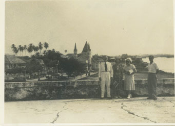 Cuatro personas sobre las murallas del cabrero, Dick, Joan Edrington, esposa del subgerente de la Andian.