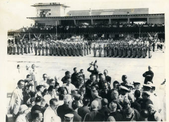 Llegada de monseñor Luís Concha, al viejo aeropuerto de Crespo. Es recibido por distintas personalidades del gobierno y de la iglesia, por tropas del ejército y estudiantes. Entre la comitiva de recibo se observa a Alberto Samudio de la Ossa.