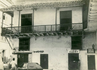 Casa en la Plaza de los Estudiantes con calle de la Universidad, barrio La Merced. Se detallan los estudios fotográficos “Emery y Vega”.