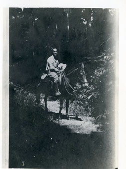 Un hombre en mula en un camino del bosque buscando donde ubicar la tubería del oleoducto Barrancabermeja – Cartagena, construido por Andian entre 1923 – 1926.