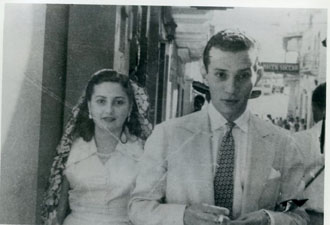 Álvaro Pinedo con su esposa, ella viste un mantuk española, por las calles de Centro,