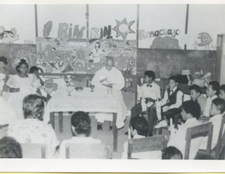 Aparece un grupo de niños y el padre celebrando la primera comunión en la escuela Funsarep del barrio paraíso II.