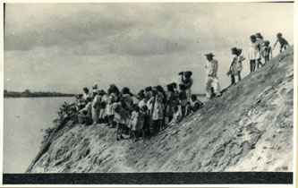 La gente observando la llegada del hidroavión en el rio Magdalena.
