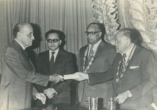 Doctor Francisco Obregón J. recibe diploma de manos del rector doctor Pedro Pacheco Osorio. Observa el decano de medicina doctor Hernando Taylor, en el paraninfo de la Universidad de Cartagena.