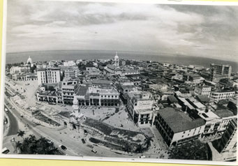 Vista aérea de la Plaza de los Coches y el Centro, se aprecia la Torre del Reloj y los diferentes edificios, rescatándose donde funciona el Banco de Bogotá sector la Matuna.