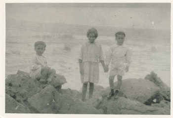 Roberto, Sixta y Luís Felipe de Zubiría sentados en los espolones en la playa.
