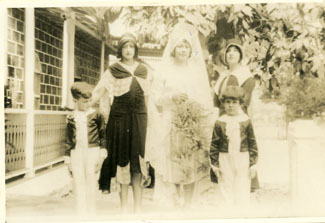 Alicia Sierra, Paulina Núñez Núñez, y Matilde Pombo Aycardi, en la boda de su hermano Santiago Núñez Núñez con Emma Díaz Granados Vega. Los pajecitos, sin identificar todavía.