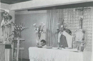 Capilla del Colegio Eucarístico de Torices, se observa al sacerdote Luis Javier celebrando la misa; se destaca la imagen de la Virgen de las Mercedes.