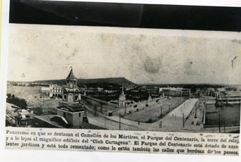 Panorama en que se destacan el Camellón de los Mártires, el Parque Centenario, la Torre del Reloj y a los lejos el magnífico edificio del “Club Cartagena”. El Parque del Centenario está dotado de excelentes jardines, todo cementado; como lo están también las calles que bordean dichos paseos.