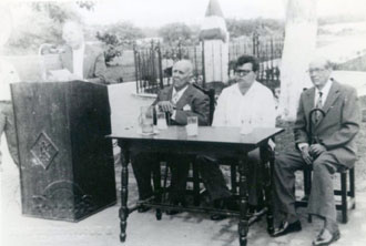 Aparece hablando monseñor Carlos José Ruiseco, con Donaldo Bossa, el gobernador Carlos Mendivil Ciadoro y el doctor Eduardo Lemaitre Román; en la ceremonia de levantamiento de una estatua de doña Soledad Román de Núñez, en el parque Apolo.