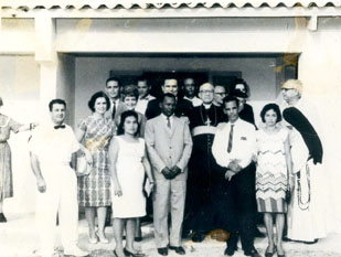 Inauguración del primer grupo de casas económicas construidas por la Asociación. En la imagen, de izquierda a derecha: en primer plano los beneficiarios. En segunda fila: Alfonso Zureck, Teresita Román de Zureck, Blanca Becerra de Román, Alberto Samudio, monseñor José Ignacio López Umaña, el alcalde Gustavo Lemaitre Román (detrás de la religiosa).