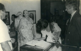 Salón del Tuerto López, gobernador Guillermo Paniza, Dorothy Jhonson de Espinosa y María Hincapié, gerente CNT, firmando libro.