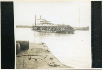 Buque cargado de materiales atravesando por el río cerca al muelle.