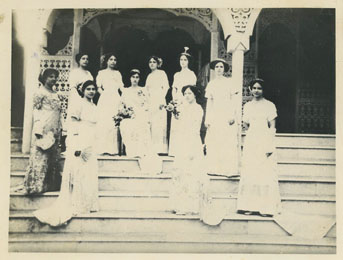 En las escaleras de mármol que conducen a la platea del Teatro Adolfo Mejía, antes Teatro Heredia, posan una reina de carnaval y su corte.