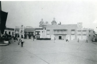Plaza de la Aduana, en el centro la estatua de Colón, a su alrededor la sede del SENA y el Banco Santander, al lado izquierdo la sede de la Alcaldía de Cartagena.